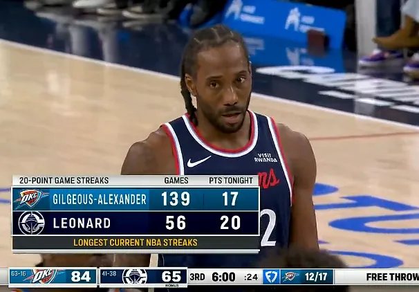 第三节比赛中,伦纳德罚球命中拿到20分,已经连续56场得到20+。